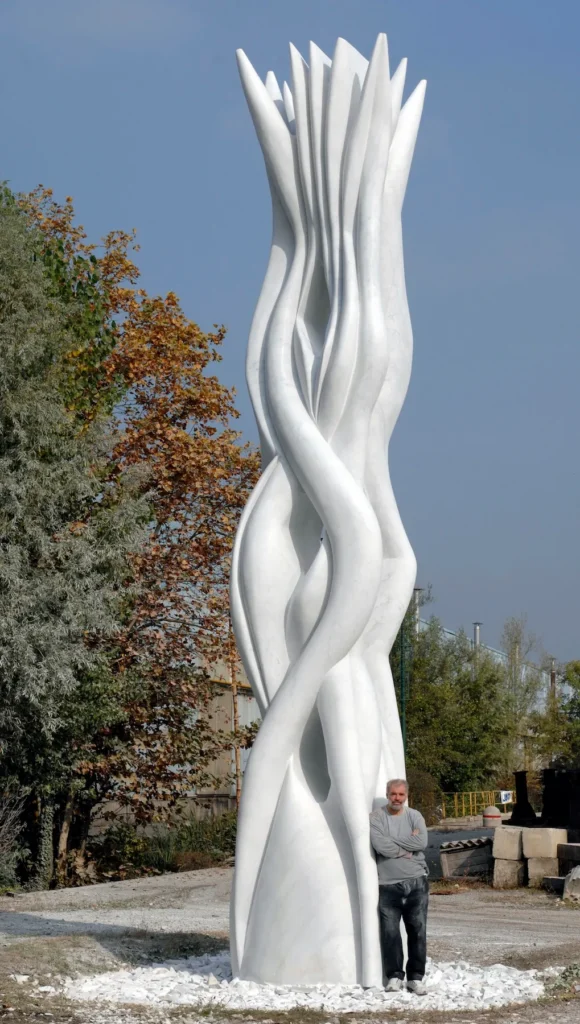 Quest’ultima è un’opera di 56 tonnellate e 8,6 m di altezza che cerca di essere un abbraccio verso l’universo, verso il cosmo, ma anche verso l’altro. Ci tengo particolarmente perché per me è portatrice di un messaggio di accoglienza umana, è il mio modo di dire che non siamo mai soli e che possiamo abbracciare tutti, anche lo sconosciuto.