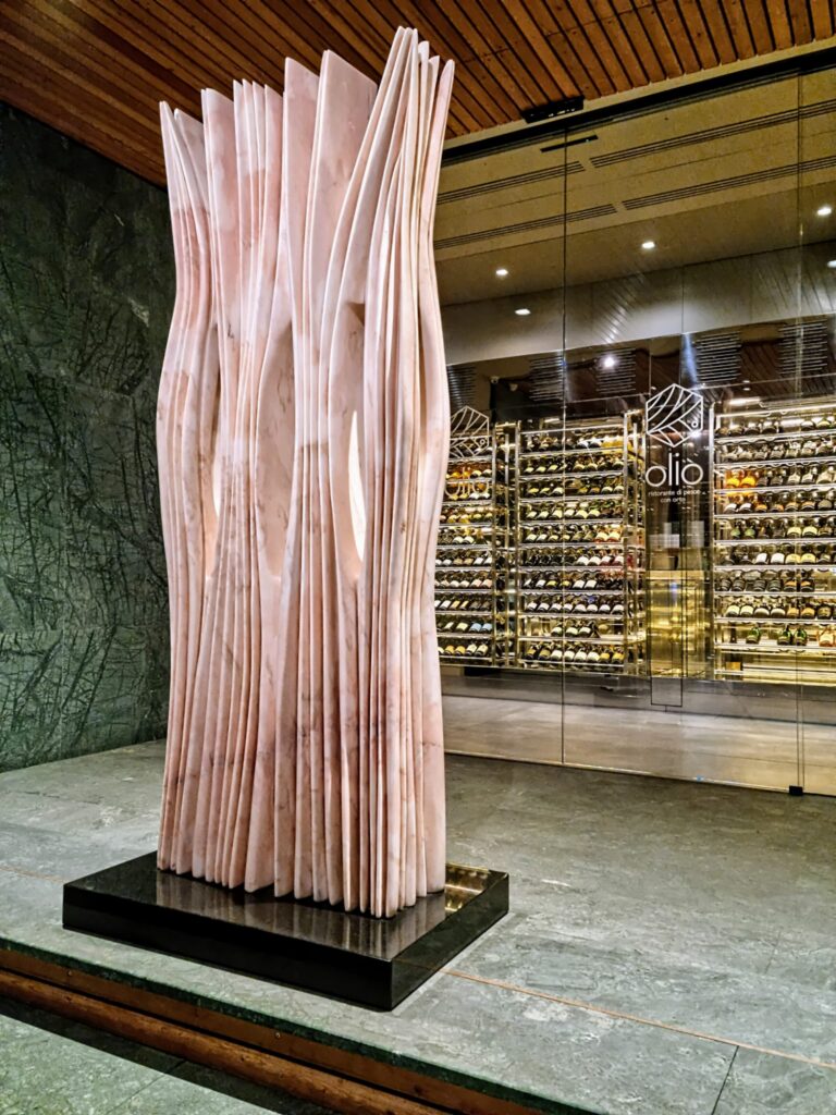 Arrivando da Spazio The Box è impossibile non soffermarsi ad osservare la scultura di Pablo Atchugarry che accoglie gli ospiti all’ingresso del Ristorante Olio. Realizzata in caldo marmo rosa con linee profondamente verticali, l’opera “Senza Titolo” dell’artista uruguayano si slancia dal suolo con un dinamismo che viene acceso e potenziato dal gioco materico di pieni e vuoti.